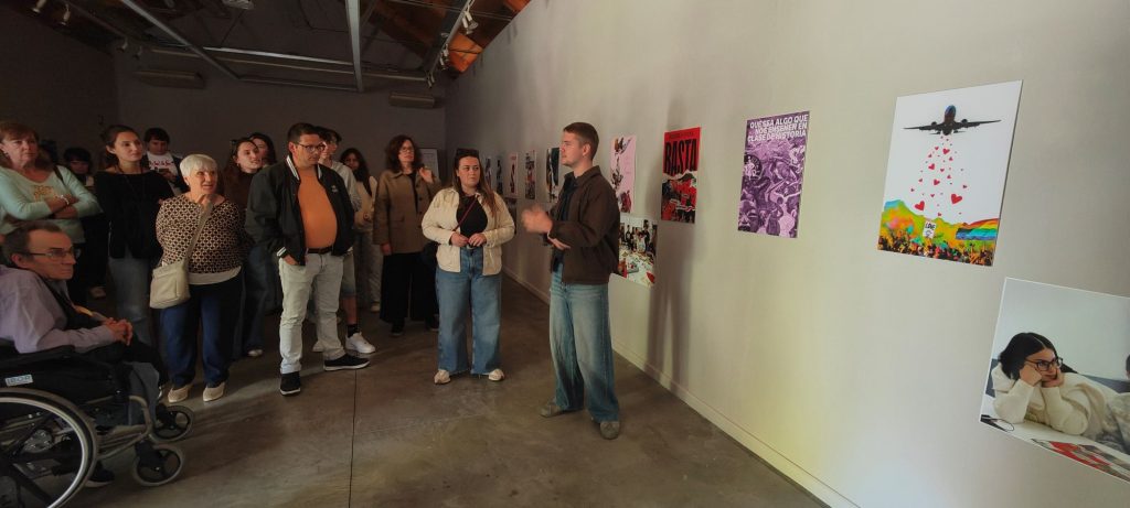 Varios estudiantes de la Escuela de Diseño han asistido a la inauguración, que se ha visto afectada en los últimos minutos por el apagón generalizado vivido hoy. A pesar de ello, han guiado al público en un recorrido por los detalles de los carteles expuestos contando que “detrás de cada uno hay un proceso manual, y después uno digital. Cada cartel tiene una estética y un estilo, pero el mismo fondo. El fin de las guerras, la necesidad de paz” han explicado.