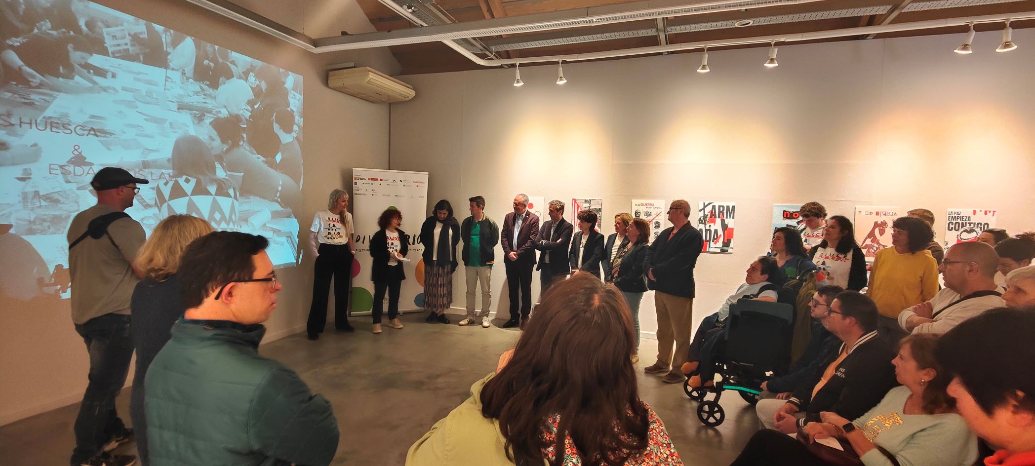 Alumnado de 3º de Diseño gráfico y representantes del grupo de personas con discapacidad vinculadas a entidades de CADIS Huesca que elaboraron las obras expuestas, han participado hoy en la inauguración.