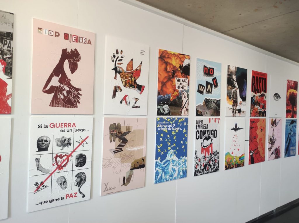 La exposición Diseño activista por la paz es fruto del trabajo colaborativo entre alumnado de 3º de Diseño gráfico de la Escuela Superior de Diseño de Aragón (ESDA) y un grupo de personas con discapacidad y profesionales vinculados a ASPACE Huesca, Cruz Blanca Huesca, Down Huesca y Valentia, entidades integradas en CADIS Huesca.