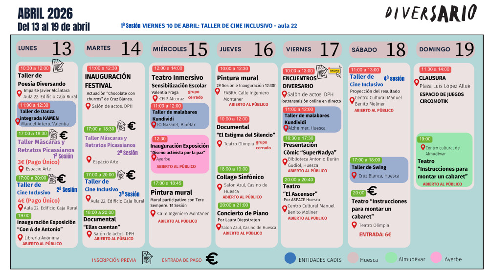 Con el «Plan de accesibilidad e inclusión» de Diversario queremos conseguir más y mejor accesibilidad para todas las personas. En él encontrarás información sobre los recursos y adaptaciones que hay para que todas las personas puedan disfrutar y participar de la 7ª edición del Festival Inclusivo de Creatividad Diversario.